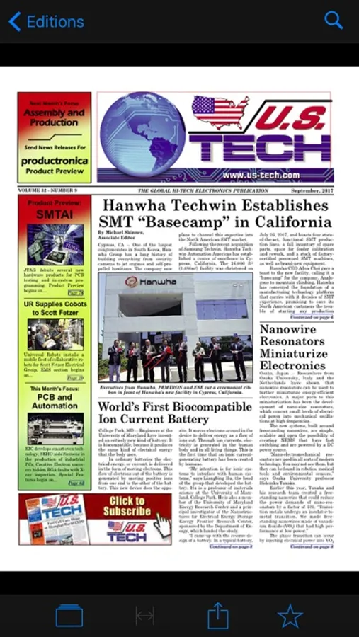 U.S. Tech is an international hi-tech electronics publication, reaching over 350,000 engineers, buyers, product specifiers and corporate managers each month, on the web and in print combined. The newspaper focuses on new innovations in components, distribution, PCB design and manufacturing, electronic contract assembly, test equipment and services, renewable energy, as well as the business and regulatory issues facing the electronics manufacturing and distribution sectors.