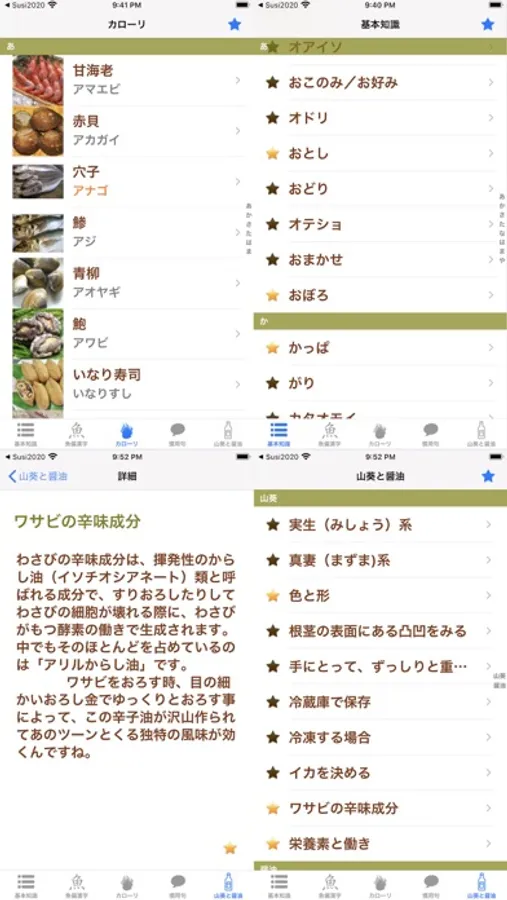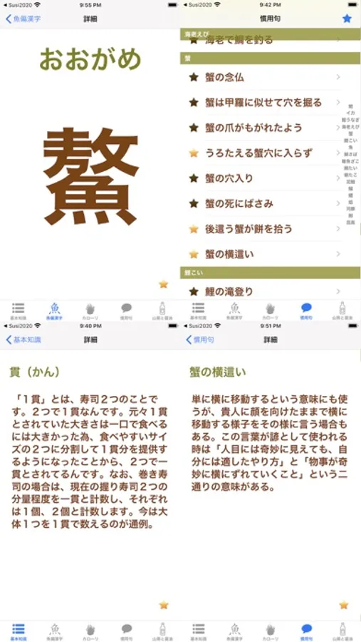 本アプリは刺身の基本知識、魚偏漢字、刺身のカローリ、旬の魚、慣用句、山葵と醤油などの情報を紹介しております。