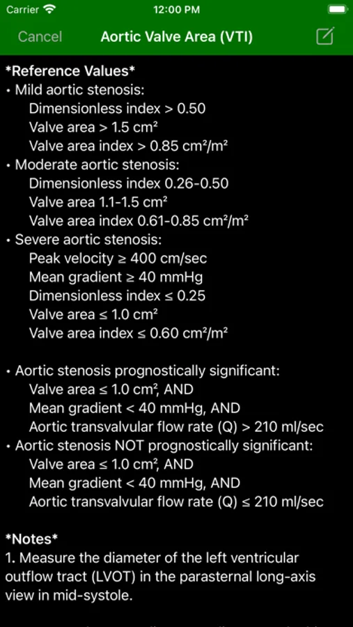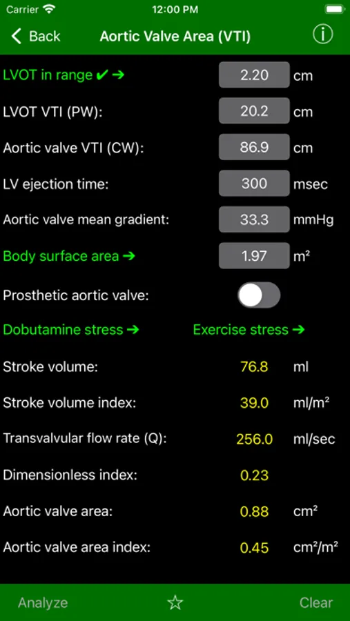 • Aortic valve area (from velocity and velocity-time integrals, including dobutamine stress with projected aortic valve area)
