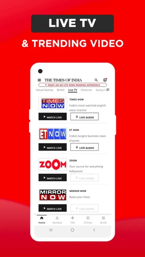 • Live TV – Watch as it happens! Catch the live coverage of all kinds of breaking news- business, Bollywood news on Times Now, ET Now, Zoom Live TV and Mirror Now TV along with audio, right in the app!