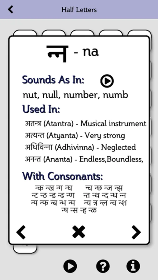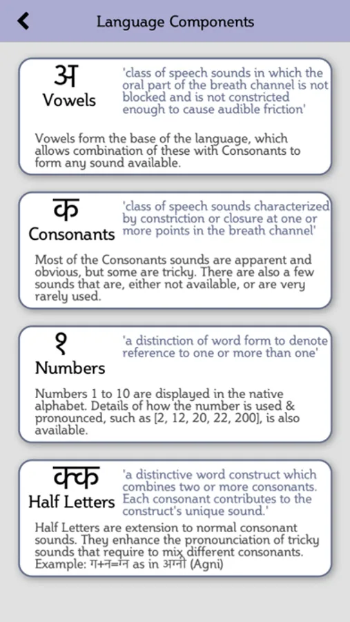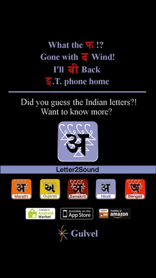 People travel, migrate and live in a multi-cultural, multi-lingual surroundings. We speak multiple languages but not necessarily read/write them. Someone who stays in US/UK but speaks their native language at home, doesn't always know how to write them, even though they know the sounds of their native language. Many also know a little bit of Kannada if staying in Bengaluru or Gujarati if staying in Ahmedabad, but while speaking, we do not know which letters in Kannada or Gujarati make the sound 'Ka'; the app hopes to teach you that.