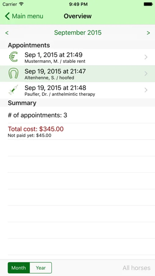 - Have a general overview per month (per year) and see the total amount paid for your horse