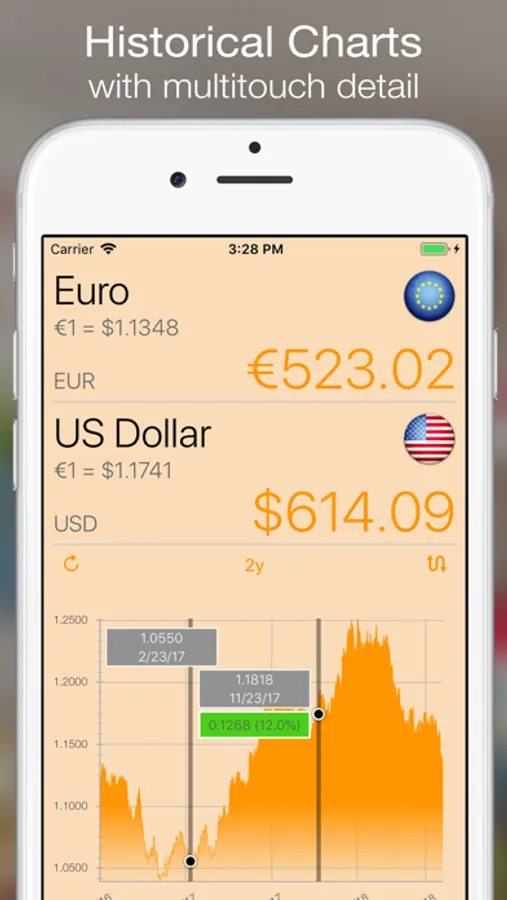 Currency+ has historical charts. You can view historical currency conversion charts for any two currencies. Touch the chart with a single finger to see data from any period in the past. Touch the chart with two fingers to compare currency exchange rates from any two past periods. Show charts for 1 day (real time intraday), 5day, 3 month, 6 month, 1 year, 2 years and 5 years.