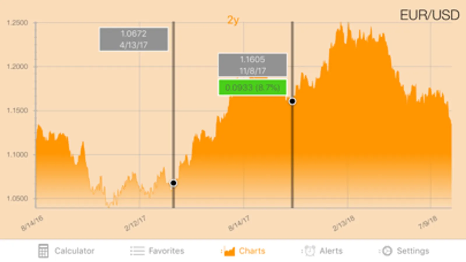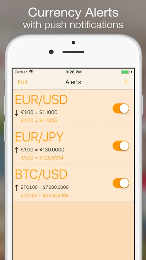 Currency+ will go out and update your currency rates without taking your device out of your pocket. Whenever you open Currency+, your data will always be up to date. Do you want to be notified when a currency goes above or below a certain value? If so, Currency+ can notify you of these changes without the need to open the app. You will receive a push notification on your device whenever the currency you are watching goes beyond the limit you set.