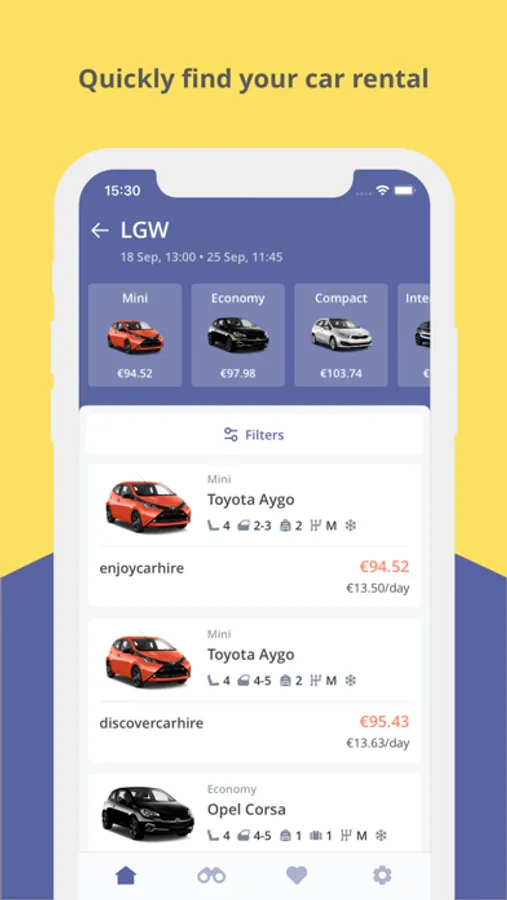 You can use filters to search by vehicle type, gearbox, fuel type, available seats and other features.