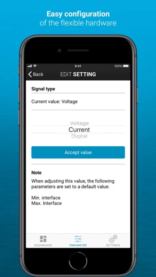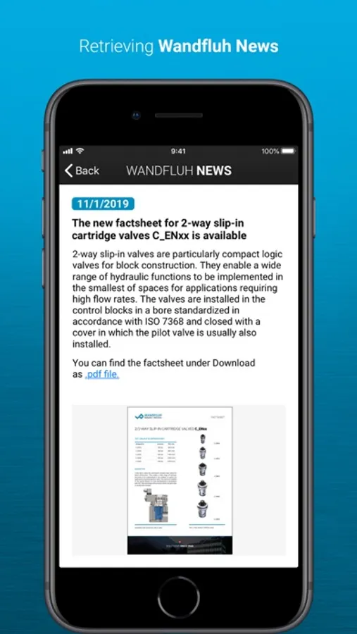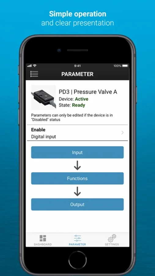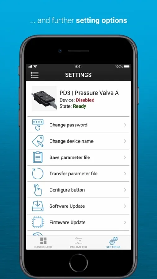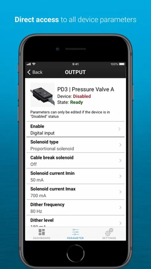 With this Wandfluh App you can parameterise the PD3 electronics wirelessly via your smartphone or tablet. The individual amplifiers within range of your Bluetooth interface can be individually selected and parameterised. Thanks to the intuitive operation of the software, configuration and parameterisation of the PD3 amplifier electronics is very simple. For the exchange of electronics, for example, entire parameter sets can also be read out, stored and uploaded again. Thanks to different diagnostic options, the app is also an indispensable companion, especially for optimising a hydraulic system or troubleshooting in the field.