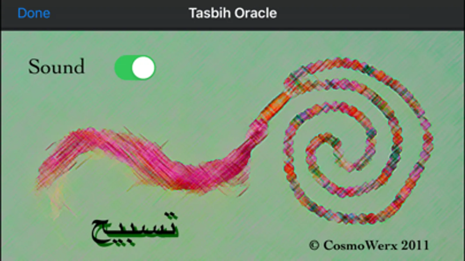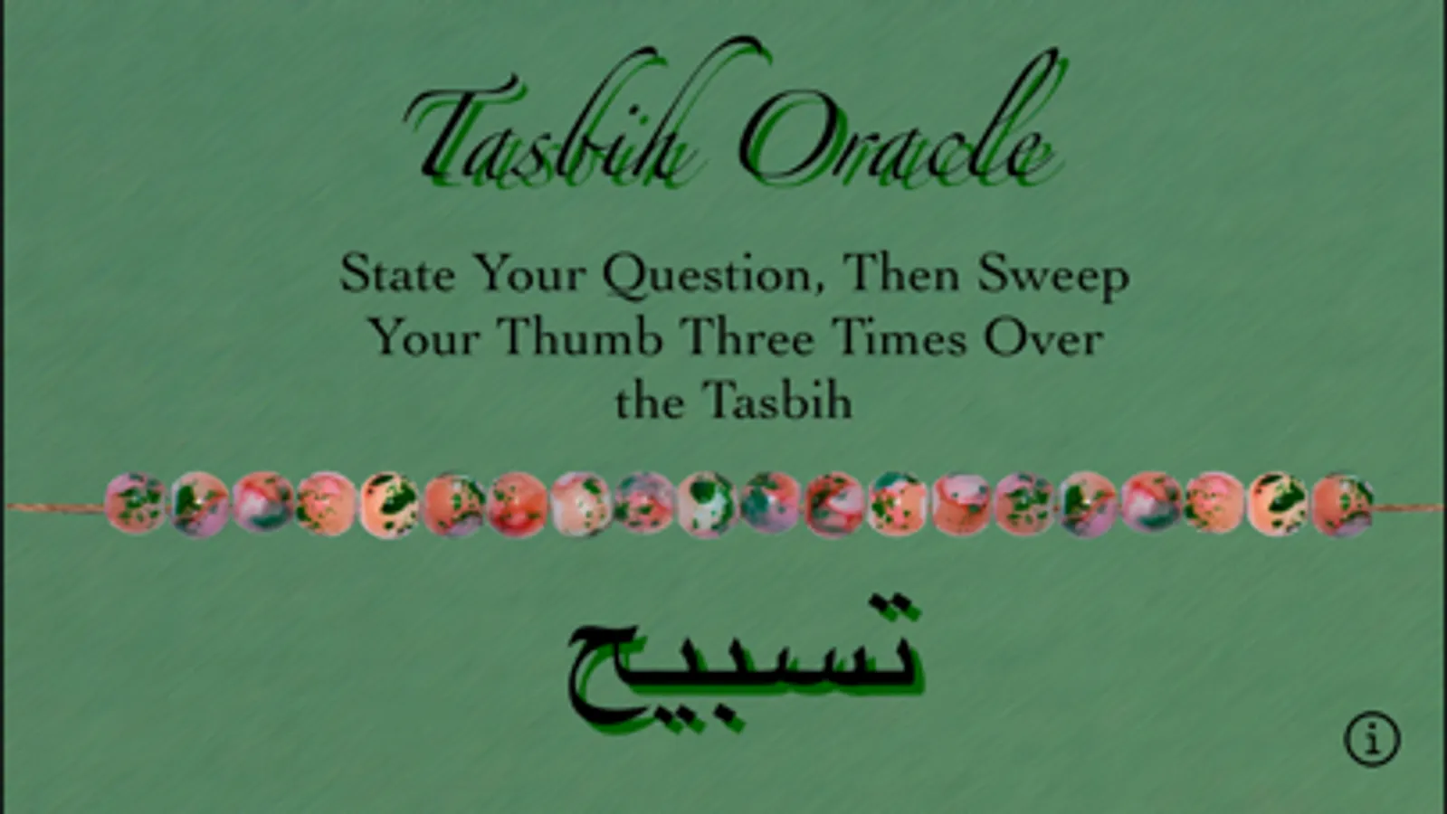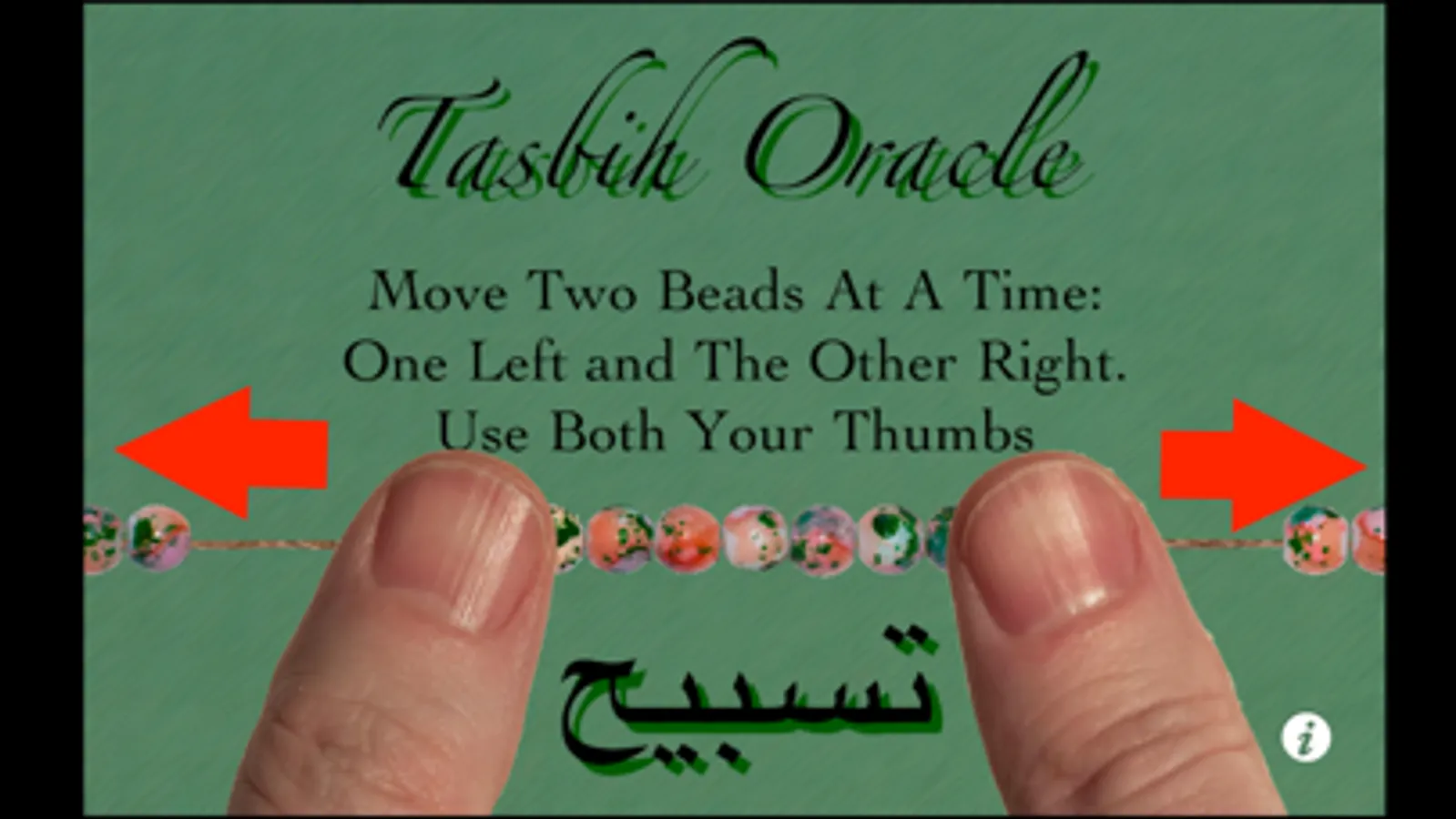 The Tasbih Oracle iPhone App is used in a similar way by using your thumbs to first create a group of beads, and then to remove two beads at a time from the group. The answer is received when one or no bead remains. The realistic sound of beads gives this simple divination app an authentic feel!
