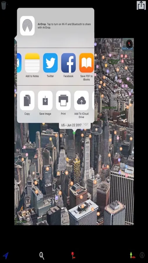 Long Press (> 1sec) in map to get "share" option to send current visible map to twitter, snapchat, tumbler, printer, iCloud, email, etc.