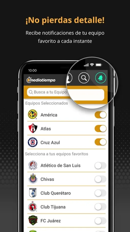 Selecciona tus equipos favoritos para recibir notificaciones cuando inicien sus partidos, goles, tarjetas y resultados finales, ¡siempre tendrás a la mano todos los resultados!