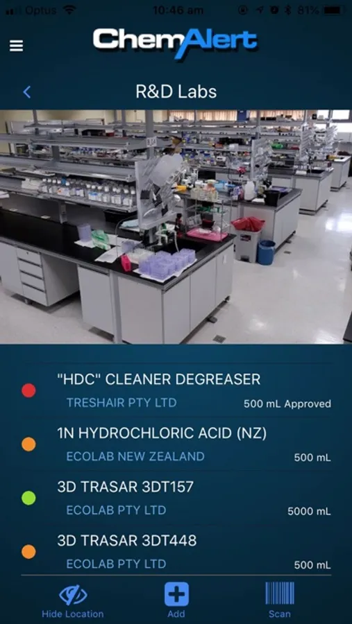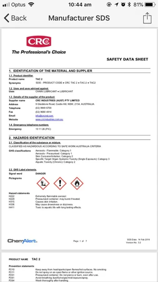 The ChemAlert mobile application integrates directly with your instance of ChemAlert. Not only does the ChemAlert app provide accurate and current product data, users can also view and update their stock inventory directly from their Smartphone device. Users can even enhance stock data by uploading pictures on the go, scan products barcode, QR codes to instantly identify and display critical safety data.