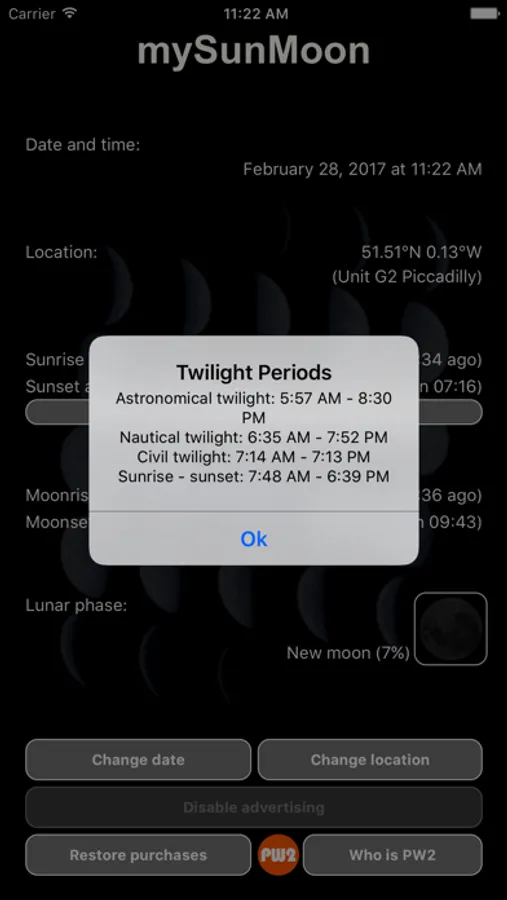 Shows sunrise, sunset, moonrise, moonset and moon phase, based on current data of device, or based on custom date and location.