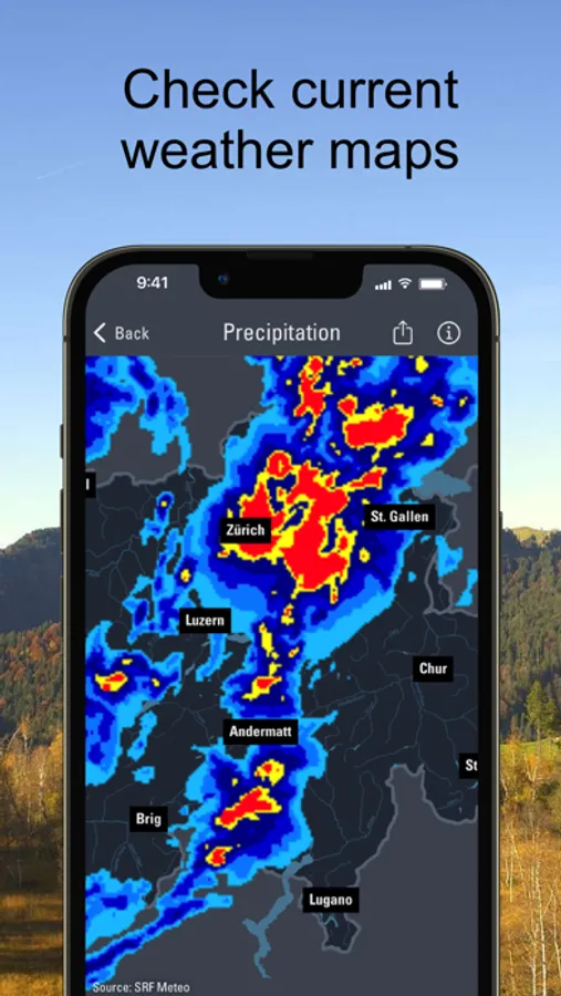 With Weather Alarm, you can set up weather notifications according to your needs. This function is ideal for not being surprised by a change in the weather on your way to work or during your leisure time. The 172 warning regions in Switzerland and Liechtenstein allow us to provide area-wide and precise warnings.