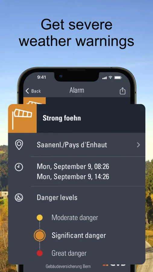 Weather-Alarm is a free service from Kantonale Gebäudeversicherungen with weather data supplied by SRF Meteo and Meteo Swiss.