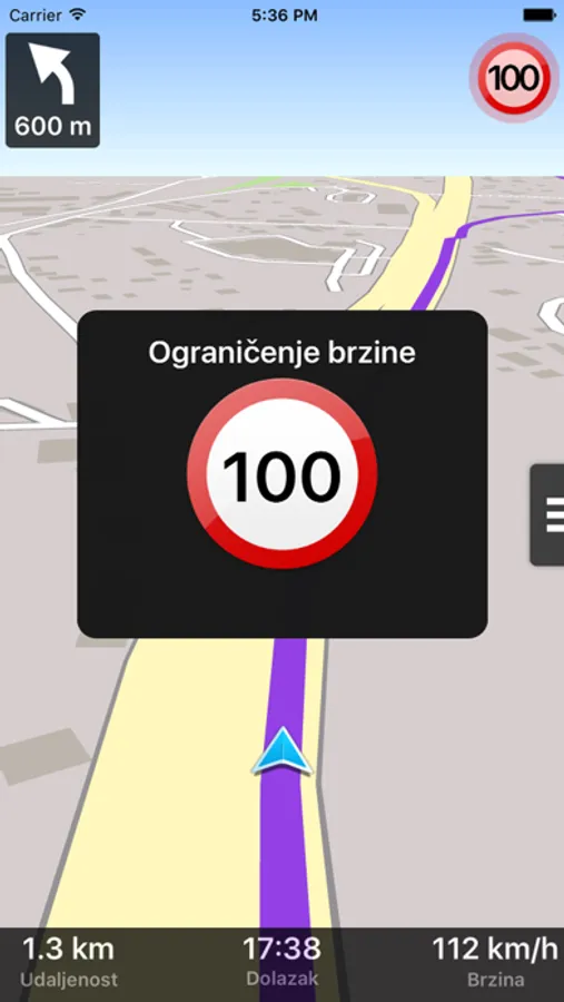 • Ograničenja brzine: prikaz ograničenja brzina na ruti kojom vozite uz upozorenje kada prijeđete ograničenje