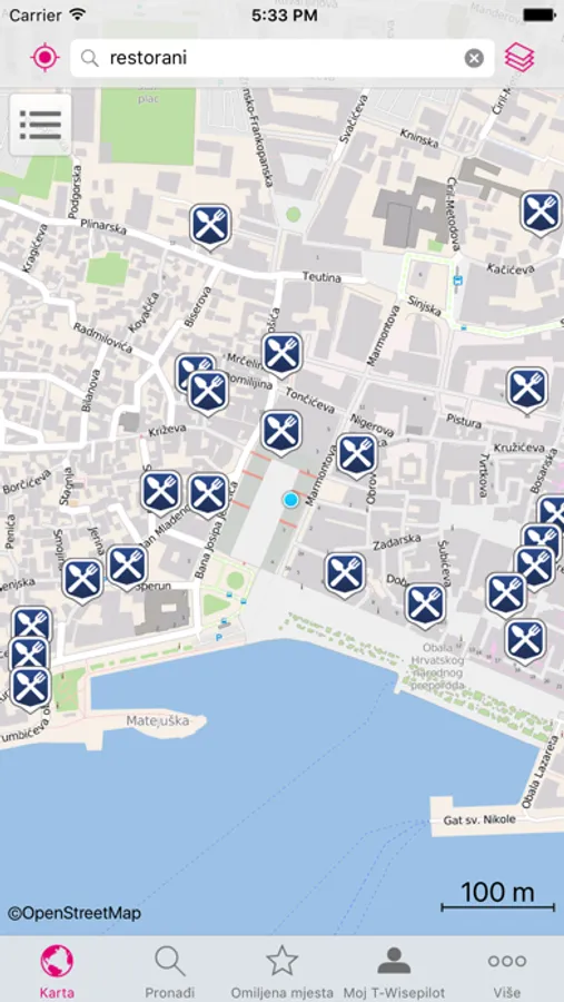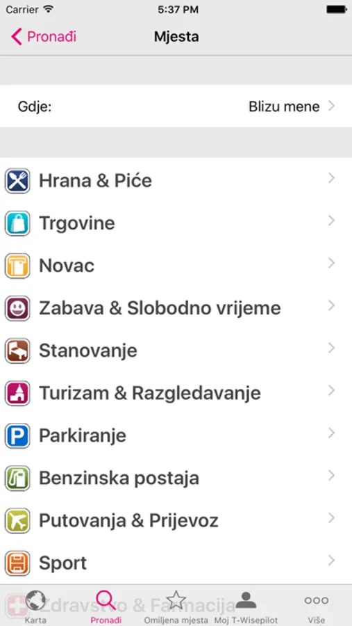 • U blizini: pronađite mjesta unutar različitih kategorija, npr. Parkiranje i Hrana&Piće