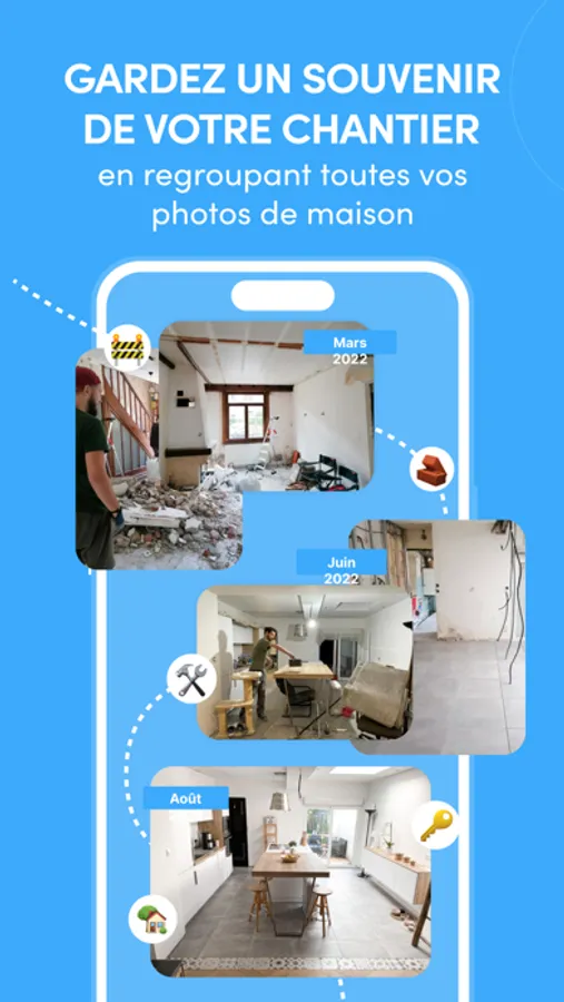 Grâce à Kozikaza, publiez les photos de votre chantier maison et écrivez l’histoire de votre maison ! Conservez tout l’historique de votre chantier et partagez vos avancées avec la communauté et vos proches. Triez vos photos de chantier et organisez-les pour mieux les retrouver.