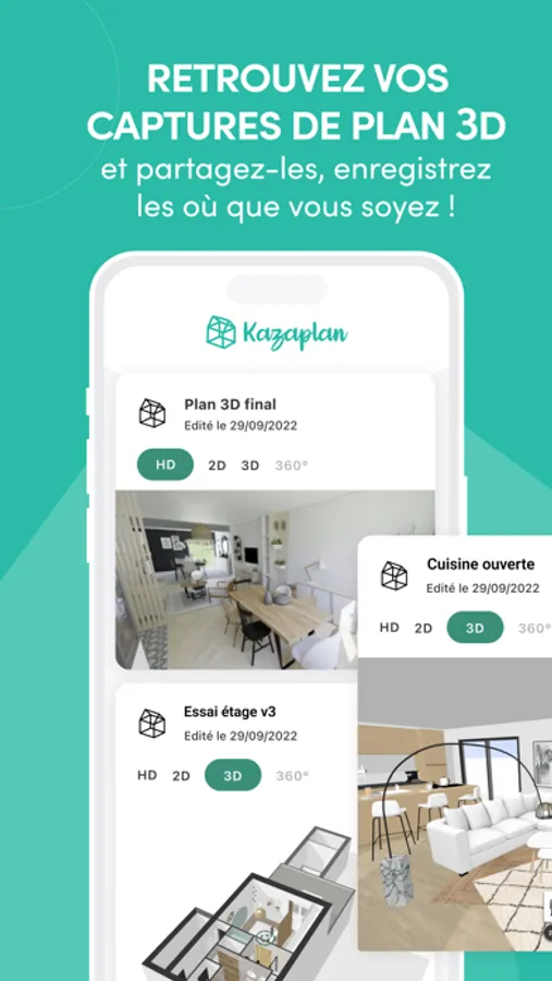 Grâce à notre application, retrouvez les captures de vos plans 2D/3D réalisés sur le site Kozikaza.com depuis un ordinateur