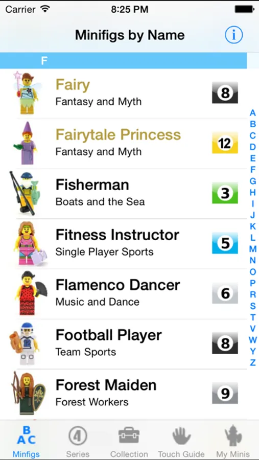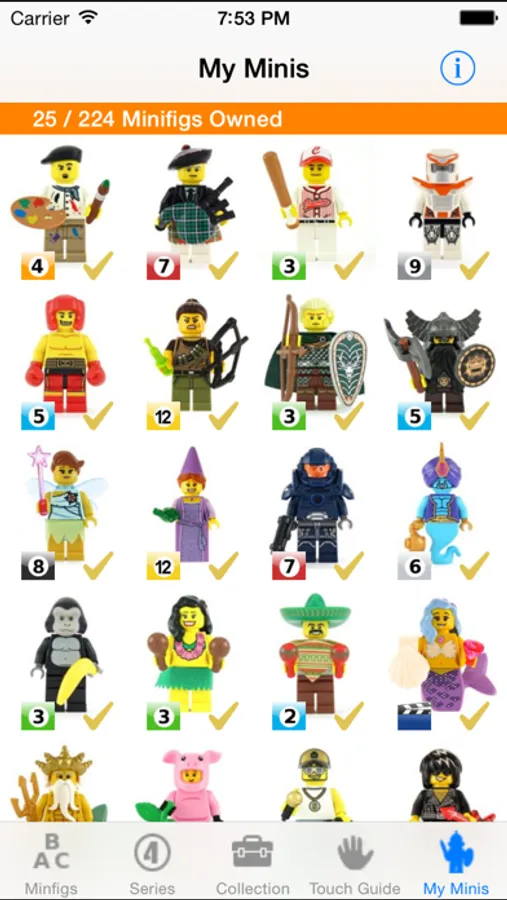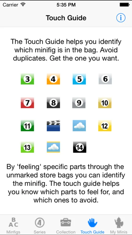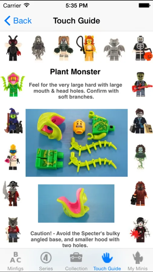 MyMinis was last updated for Series 14 with 16 awesome minifigures! Use the Photo Touch Guide to find what figure is hidden in the bag by touch, the best way to find them all! See the Plant Monster, Spider Lady, Galaxy Trooper, Hod Dog Man, Snake Charmer, Wizard, Fairytale Princess, Swashbuckler, Piggy Guy, Gingerbread Man, Ice Skater, Island Warrior, Bumblebee Girl, Fairy, Skier, Roman Commander, Leprechaun, Genie, Gladiator, Cheerleader, Soccer Player, and more! All 272 LEGO® collectible minifigures are here from Series 1-14 (including the 3 special themed additional series). You can see your own collection, or browse by name, series, rating, or theme (music and dance, or exploration and discovery for instance). Manage your collection, and use the Touch Guide at your nearest store and complete your collection today!