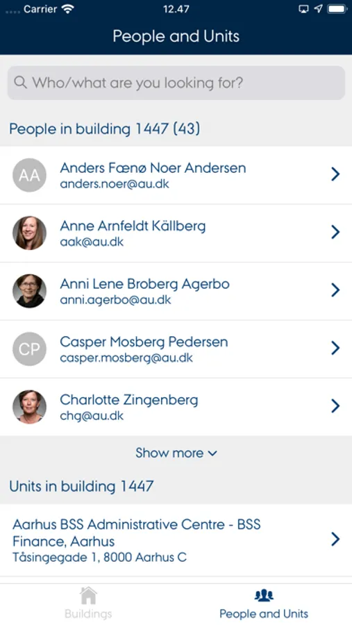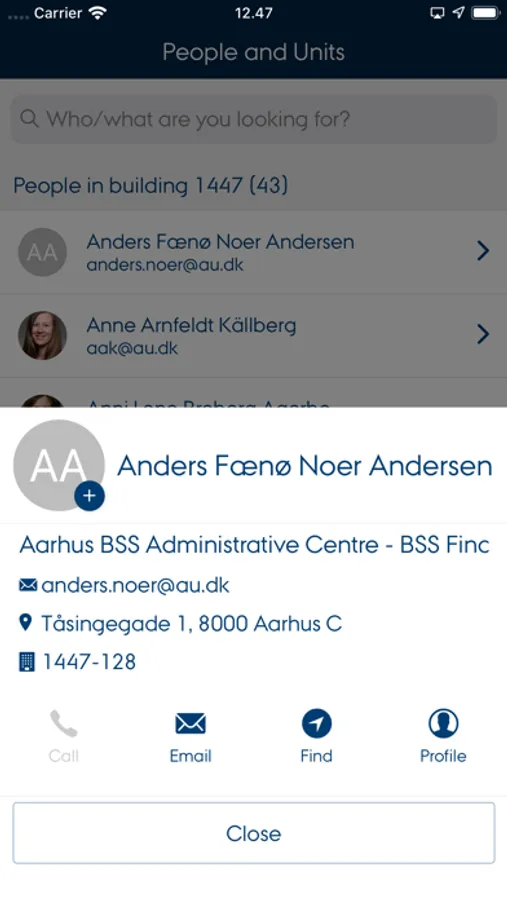 AU Find is an app developed for employees, students, etc. at Aarhus University. With AU Find you can find contact information for people at AU, find your way on the map, search for departments, building numbers and add people directly to your contacts.