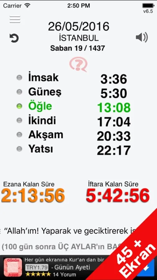 - Ezan kalan süreyi (Türkçe) sesli hatırlatma,