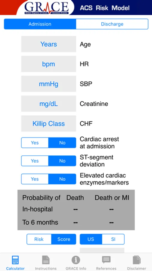 This tool implements GRACE risk nomograms for death and death/MI using two risk calculators: