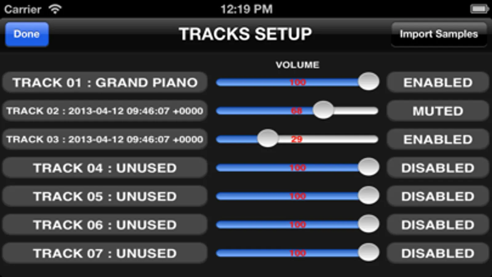 Just record a single sound / voice / special effect "A note" using the samplerSequencer audio recording feature (using the internal microphone of the device) or import the sound into the device through synchronization (using the iTunes software for Mac or PC) or with copy / paste using the technology "iTunes File Sharing" and samplerSequencer will create for you the whole scale of sounds and assign them to the virtual keyboard (n octaves) of samplerSequencer, so you can record an audio track using the sequencer recording feature of samplerSequencer (the sequencer records for you every note played by you).
