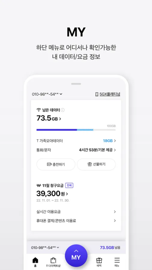 자주 찾는 실시간 잔여량, 청구요금, 가입 정보는 어디서나 확인 수 있는 MY 화면을 통해 한 눈에 모아보세요.