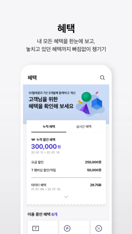 내가 받은 혜택을 모아서 보여주며, SK텔레콤이 제공하는 다양한 혜택과 이벤트를 확인/이용할 수 있습니다.