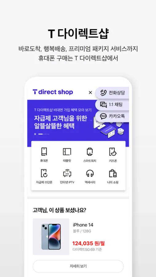 휴대폰/태블릿/스마트워치/휴대용 와이파이/키즈폰/IPTV/액세서리 등을 바로 구매할 수 있습니다.