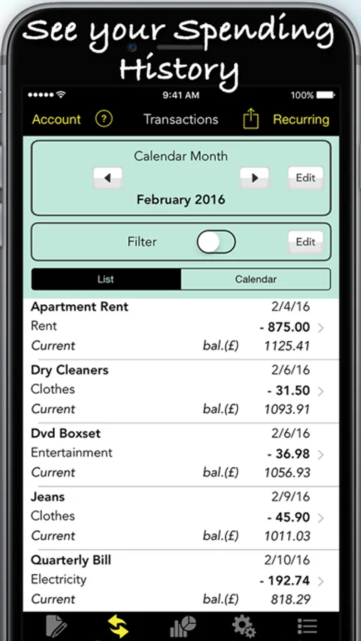 √ View your logged Transactions in a Bank Statement like format and on a Calendar
