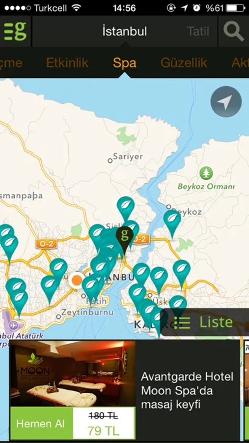 Sağ alt köşedeki konum ikonuna tıklayın. Harita size buluduğunuz yeri ve etraftaki fırsatları gösterecek. Grupanya pin’lerine tıklayarak fırsat içeriğini harita üzerinde görebilirsiniz. Size en yakın fırsatları kaçırmamak için konum bilgilerinize erişim izni vermeyi unutmayın!