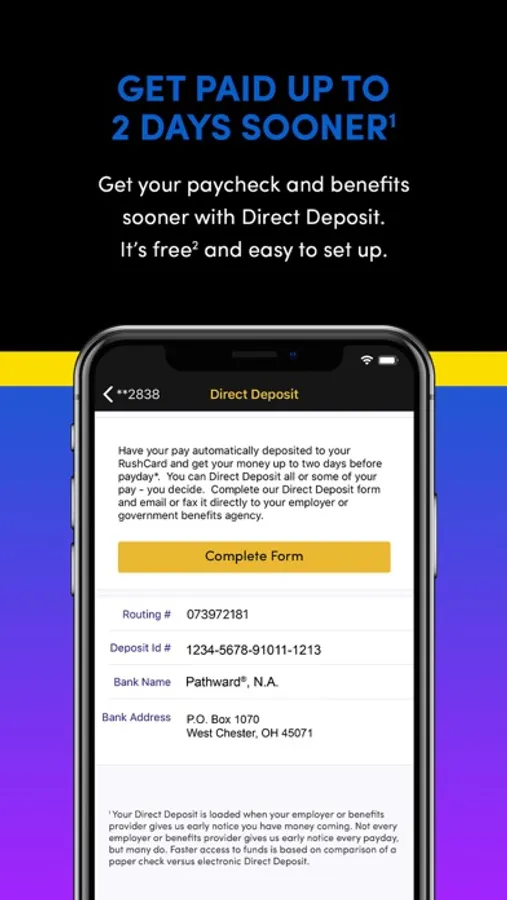 Built on 23 years of banking innovation, GO2bank comes with the features you loved with RushCard like early direct deposit¹ and a free nationwide ATM network². Plus, enjoy even more benefits like: