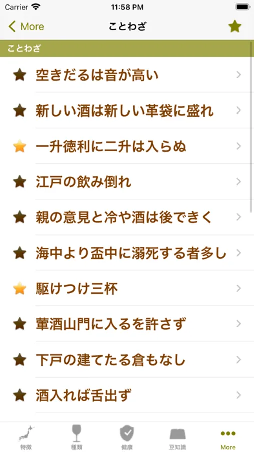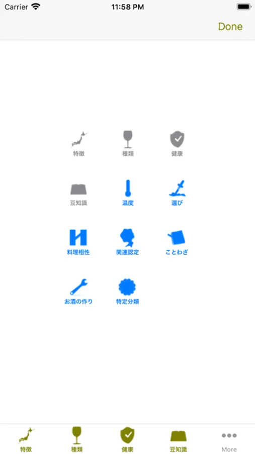 本アプリは日本の酒の特徴、種類、健康、豆知識、お酒の温度、選び方法、料理相性、関連認定、ことわざ、お酒の作り方と特定分類などの知識を紹介しております。