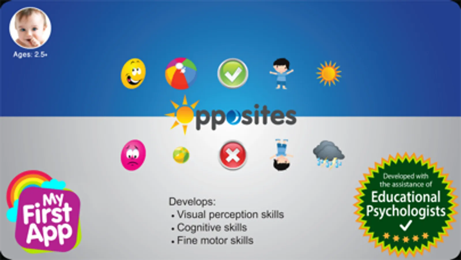 Opposites helps develop important cognitive skills such as: categorization, conceptualization, relations, generalization and abstraction. It also helps develop visual perception skills and fine motor skills. With parental assistance it can also develop language skills, for example, by naming the objects and the colors.