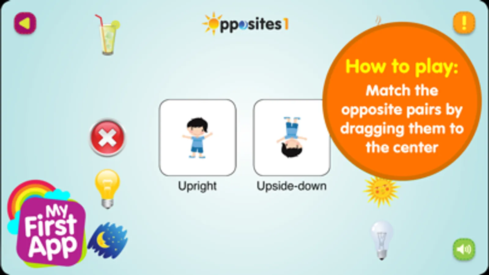 Opposites 1 - Is designed for children aged 2.5+. It contains the following opposites words: Up / Down, Light / Dark, Happy / Sad, Right / Left, Asleep / Awake, Hot / Cold, Day / Night, Right / Wrong, On / Off, Upright / Upside-down, On / Under, Near / Far, Locked / Unlocked, Long / Short, Stop / Go, Whole / Broken, Big / Small, Clean / Dirty, Tall / Short, Sunny / Rainy, Happy / Sad, Plus / Minus, Inside / Outside, Thick / Thin, Full / Empty, Heavy / Light, Many / A few, Bent / Straight, Up / Down, Fast / Slow.