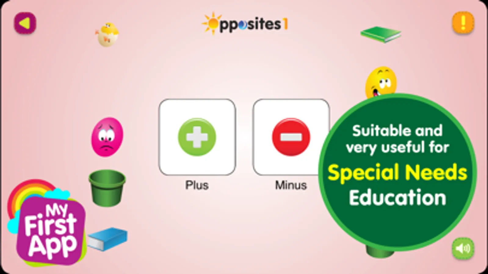 Opposites 2 - Is designed for children aged 3+. It contains the following opposites words: Above / Below, Angry / Calm, Start / Finish, Black / White, Brave / Coward, Closed / Open, Deep / Shallow, First / Last, Front / Back, Go in / Go out, Going up / Going down, Hard / Soft, Healthy / Sick, Landing / Take off, Loud / Quiet, Male / Female, Neat / Messy, Old / New, Push / Pull, Same / Different, Sharp / Blunt, Sink / Float, Stand / Sit, Strong / Weak, Sweet / Sour, Thin / Fat, Throw / Catch, Wet / Dry, Win / Loss, Young / Old.