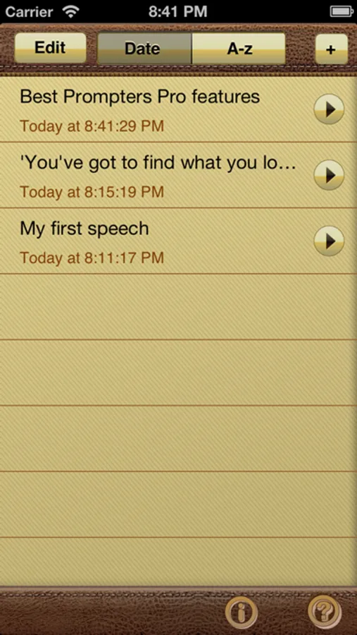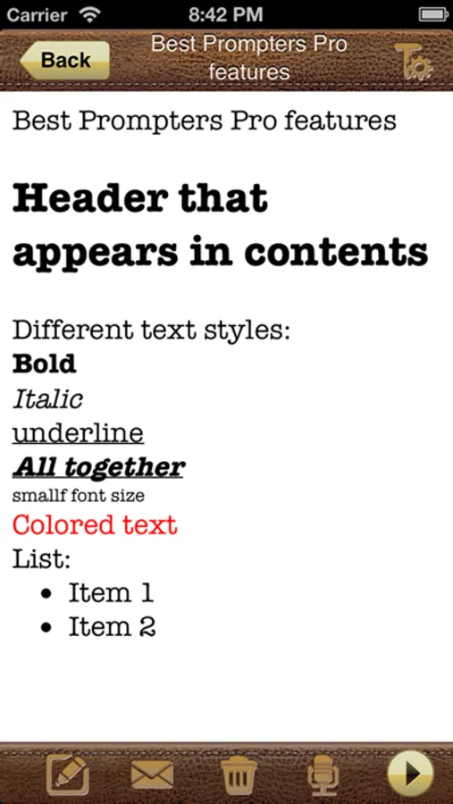 Besides general "must have" features such as text size, colors, smooth scrolling, mirror mode and so on, Best Prompter also has an audio recorder