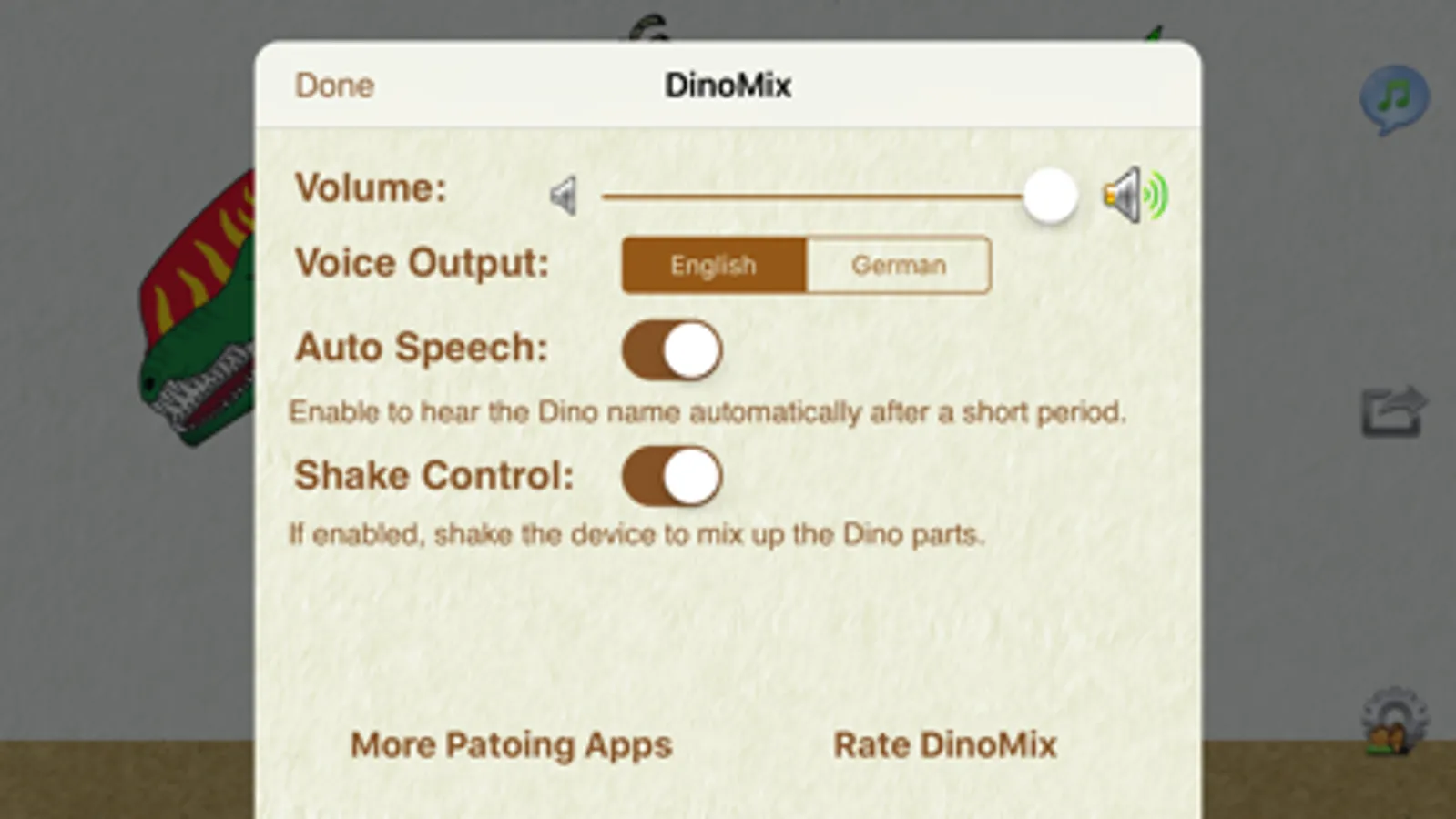 The scientific dinosaur name is displayed below the animal and spoken out aloud (your kids do not need to be able to read - yet) in English or German.