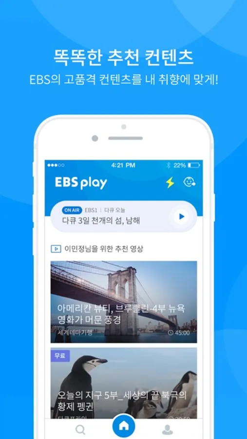 EBS play provides a variety of different VOD contents as well as real time broadcasting of EBS1, EBS2, EBSU, PLUS1, PLUS2 and EBSe.