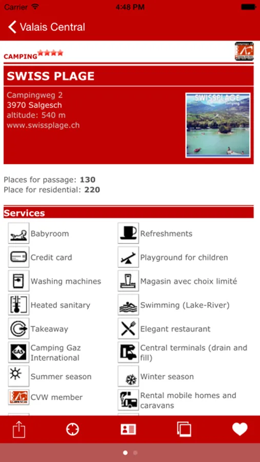 The application « The Campsites of Valais » allows you the consultation of the information on the camping’s of the association of Valais (situation, photos, prices, equipment) and their research by name, or according to criteria of geographical localization.