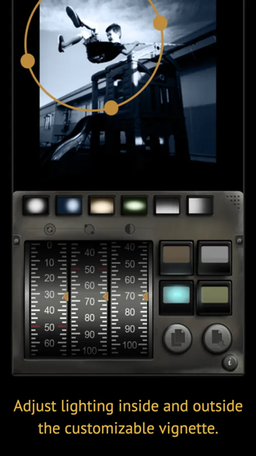 • Everything is at your fingertips. Three simple dials control the lighting inside and outside the vignette, and overall contrast.