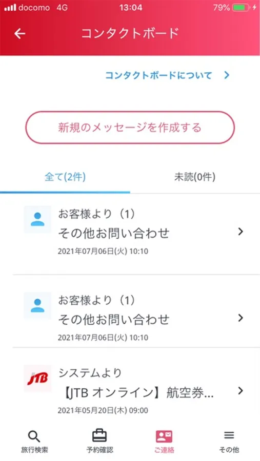 予約済の旅行に関するメッセージの送受信もアプリから。お店の営業時間にご来店、お電話いただけない時にも安心で便利な機能です。
