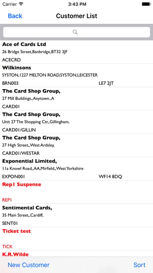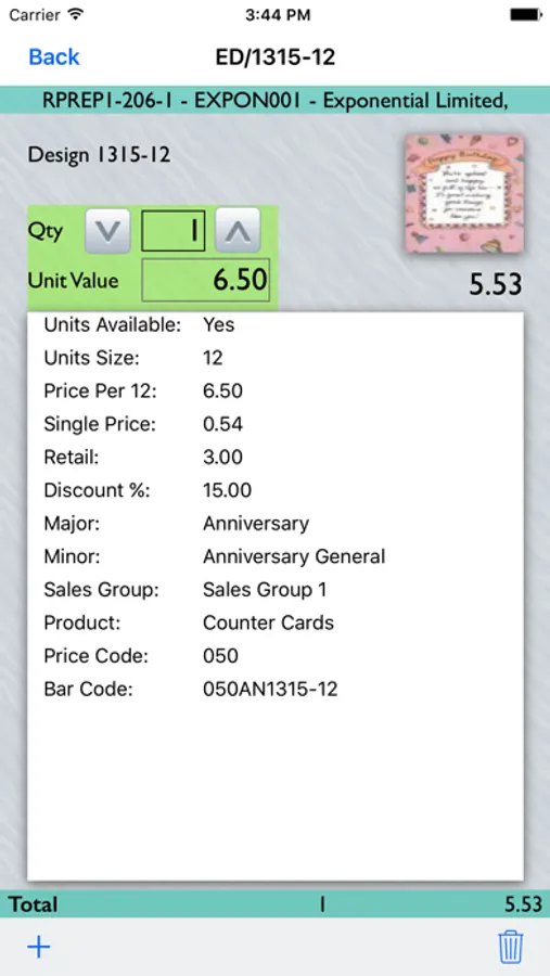 The application provides details of customer accounts, products, product availability, order history. It allows orders to be created via screen selection or via a bluetooth bar code scanner connected as an HID device. The program can also accept store ticket barcodes commonly used in the greeting card industry.