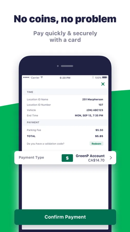 Use either a credit card, Apple Pay or your PayPal account to pay for parking. You can use an existing PayPal account or set up a new one from the app– it’s another great way to pay for parking on the Green P app.