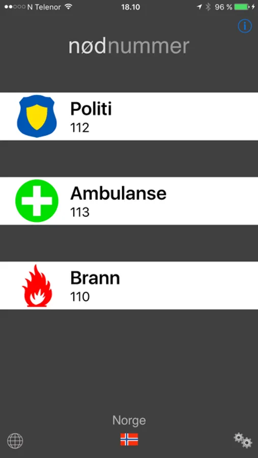 Du har sikkert vært på ferie i utlandet eller på foretningsreise? Har du lurt på hvordan man ringer politiet? Brannvesenet? Eller en ambulanse? Få hjelp hvor som helst i verden! Et enkelt trykk, og App'en ringer riktig nødnummeret uansett hvor du befinner deg. App'en finner hvilket land du er i (eller du kan velge det) og setter deg i kontakt med riktig nødetat.