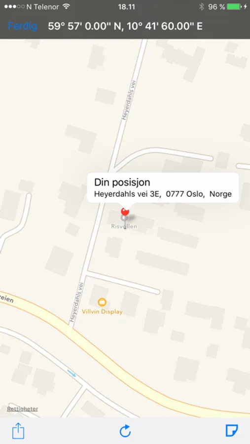 Viser din GPS-posisjon, landet du er i og nærmeste gate-adresse hvis tilgjengelig. (Krever internett).