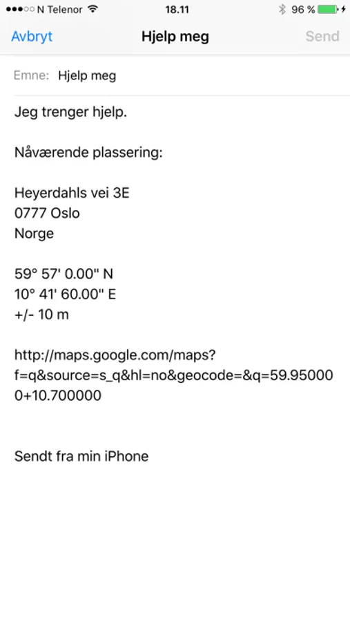 Send SMS eller e-post med forhåndsutfylt tekst på ditt språk, inkludert landet du er i, din posisjon, nærmeste gate-adresse hvis tilgjengelig og html link til google maps.