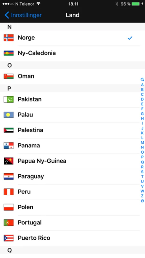 Velg mellom indekssøk og frisøk for å raskt velge landet. Hvert land er listet med navn og nasjonalt flagg.
