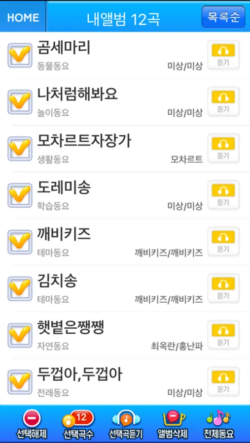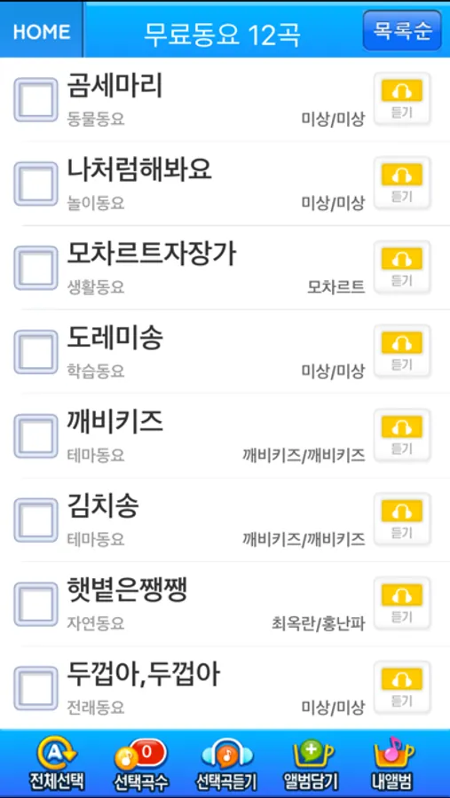 * 앨범담기 : 자녀가 또는 부모님이 좋아하는 곡을 앨범에 담아둘 수 있습니다.