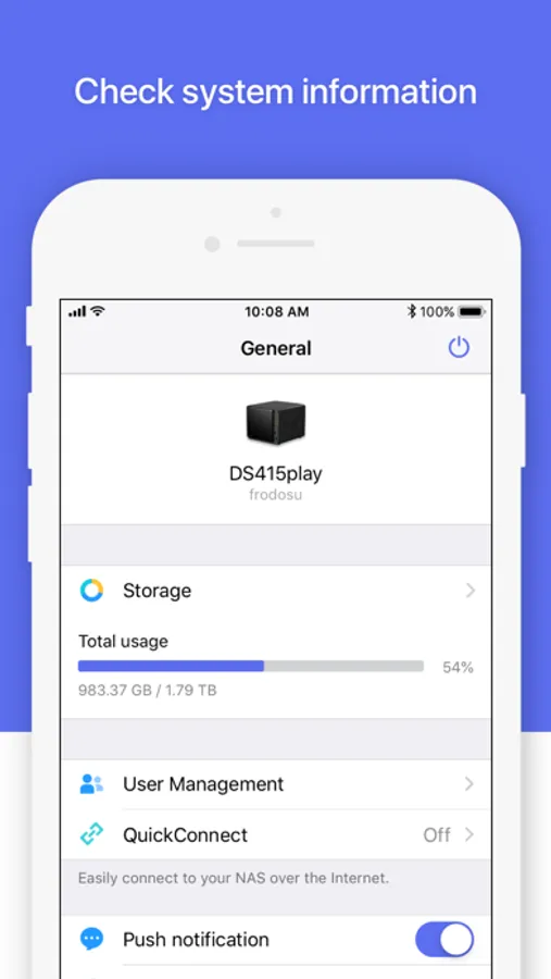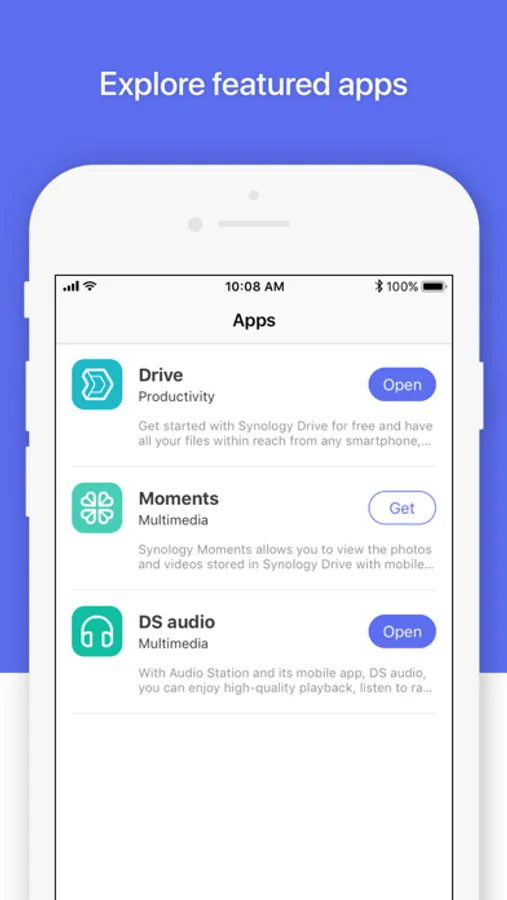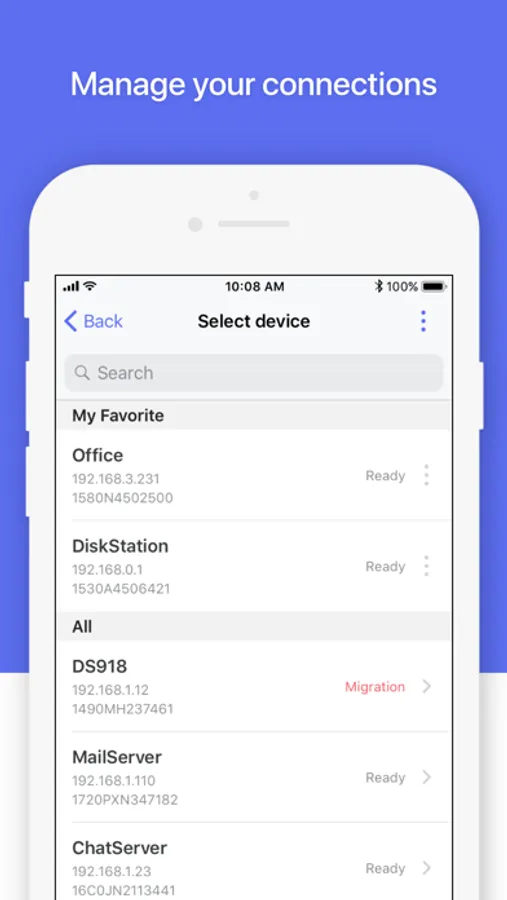 DS finder allows you to set up and manage your Synology NAS, sends you NAS-related notifications, and opens your door to the world of Synology apps. And yes, all these features can be accessed directly from your phone, so wave goodbye to complicated setup and management with DS finder!